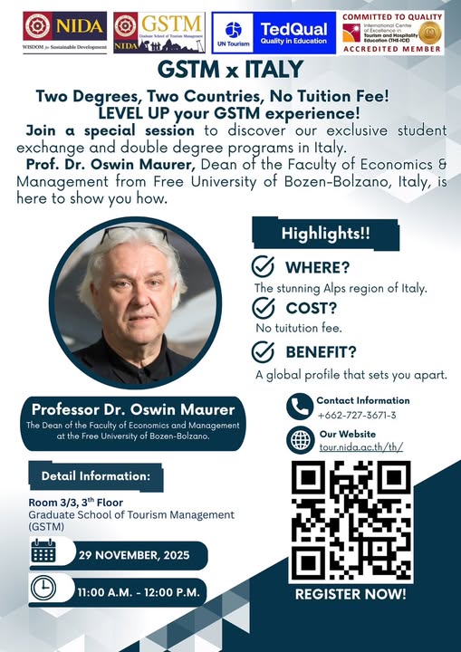“Opportunities for Exchange Students & Double Degree Programs between GSTM, NIDA and the Faculty of Economics and Management Free University of Bozen-Bolzano, Italy”